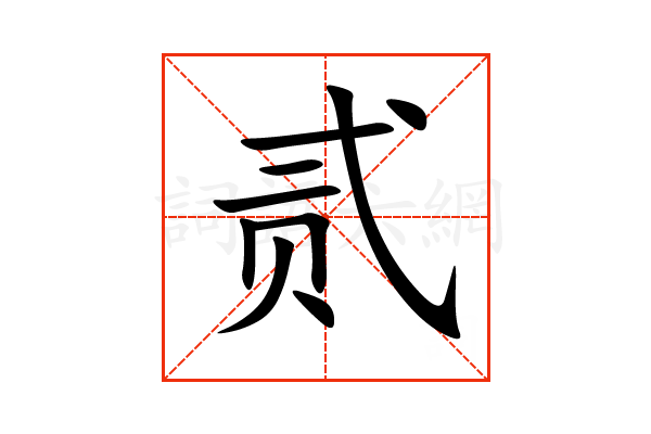 贰,通用规范汉字,一级汉字,读音是(èr),贝部,共9画,形声字,半包围结构,五行属金。