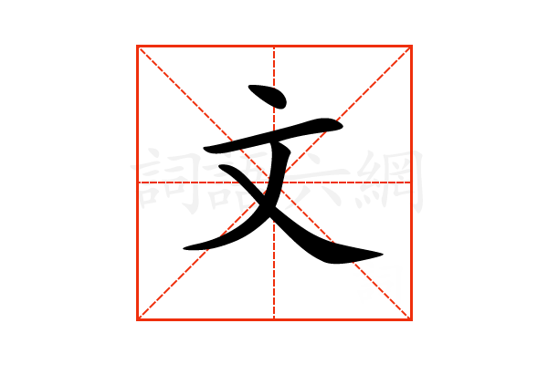 文,通用规范汉字,一级汉字,读音是(wén),文部,共4画,象形字,独体字,五行属水。