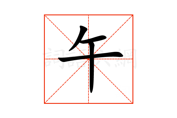 午,通用规范汉字,一级汉字,序号0119,读音是(wǔ),十部,共4画,象形字,独体字,五行属火。