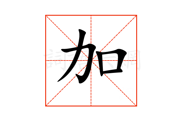 加,通用规范汉字,一级汉字,读音是(jiā),力部,共5画,会意字,左右结构,五行属木。