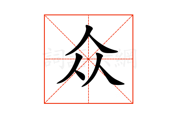 〔众〕字是品字结构,三叠字 (三角三叠字),可拆字为“人、从”,五行属金。
