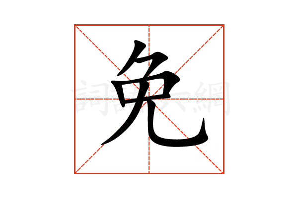 〔免〕字是上下结构,可拆字为“⺈、丿、乚、口”或“⺈、𫩏、儿”,五行属火。