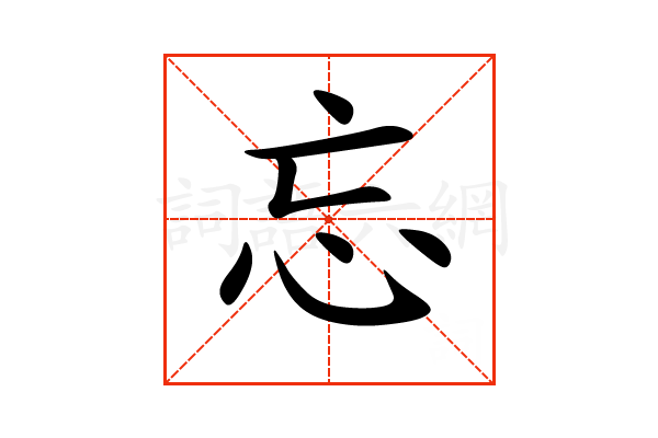 〔忘〕字造字法是会意兼形声。从心,从亡,亡亦声。本义是忘记,不记得。
