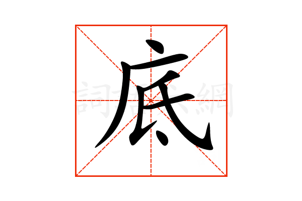 底,通用规范汉字,一级汉字,序号1212,多音字,读音是(dǐ 或 de),广部,共8画,半包围结构,五行属火。