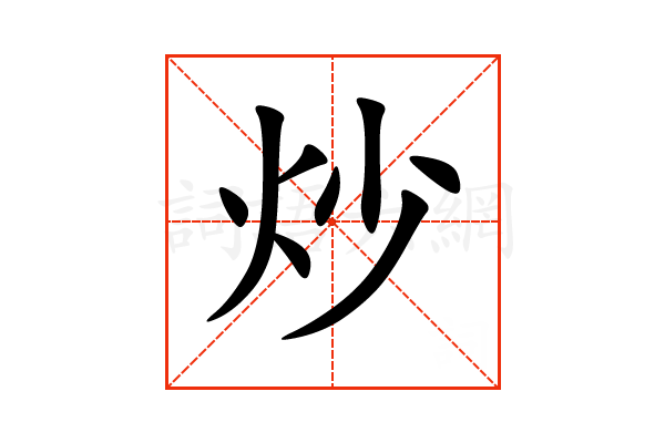 炒,通用规范汉字,一级汉字,序号1234,读音是(chǎo),火部,共8画,形声字,左右结构,五行属火。