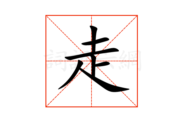 〔走〕字造字法是会意。金文字形象摆动两臂跑步的人形,下部象人脚。合起来表示人在跑。本义是跑。