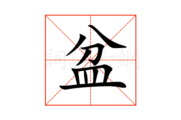 〔盆〕字造字法是形声。从皿,分声。皿,泛指盘碗一类器具。本义是盛东西或洗涤用的器皿。通常为圆形,口大底小,比盘深。