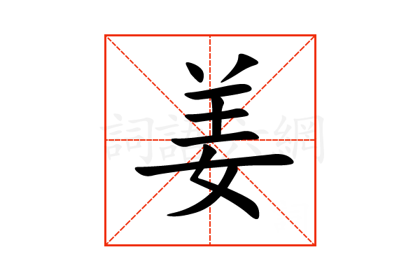 1.形声。从女,羊声。本义:水名。姜水。