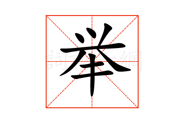 举,通用规范汉字,一级汉字,序号1693,读音是(jǔ),丶部,共9画,形声字,上下结构,五行属木。