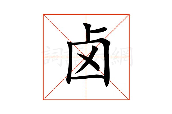 〔卤〕字造字法是象形。金文字形,象盐罐( 或盐池 )中有盐形。本义是盐碱地。