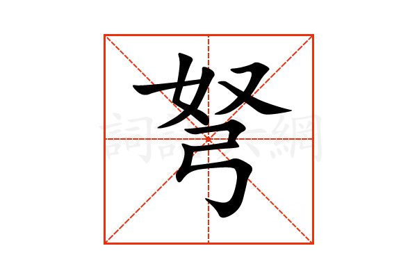 1.形声。从弓,奴声。本义:用械发箭的弓。