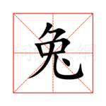 1兔,通用规范汉字,一级汉字,序号1195,读音是(tù),⺈部,共8画,象形字,上下结构,五行属金。 兔字概述 〔兔〕字拼音是(tù),部首是⺈部,总笔画是8画。 〔兔〕字是上下结构,可拆字为“⺈、丿、乚、口、丶”或“免、丶”,五行属金。 〔兔〕字造字法是象形。象踞后其尾形。本义是哺乳类动物,通称兔子。 〔兔〕字仓颉码是NAHI,五笔是QKQY,四角号码是2...