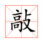 1敲,通用规范汉字,一级汉字,序号3140,读音是(qiāo),攴部,共14画,形声字,左右结构,五行属木。 敲字概述 〔敲〕字拼音是(qiāo),部首是攴部,总笔画是14画。 〔敲〕字是左右结构,可拆字为“高、攴”,五行属木。 〔敲〕字造字法是形声。从攴,高声。攴, pū,轻击。象手( 又 )拿小棍轻击的样子。本义是敲击,叩打。 〔敲〕字仓颉码是YBYE,五...